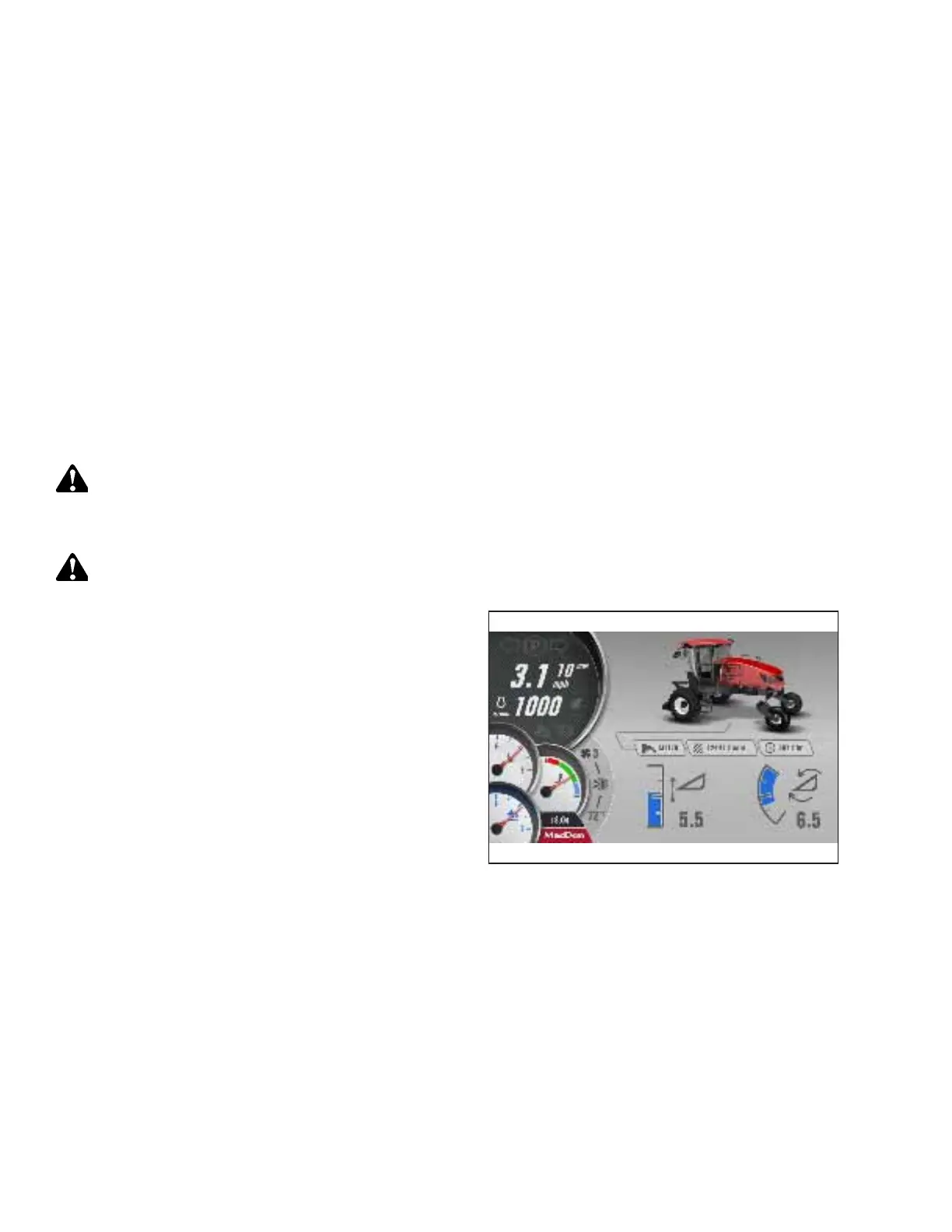 The Harvest Performance Tracker (HPT) display shows the windrower’s performance gauges. Ensure that the gauges