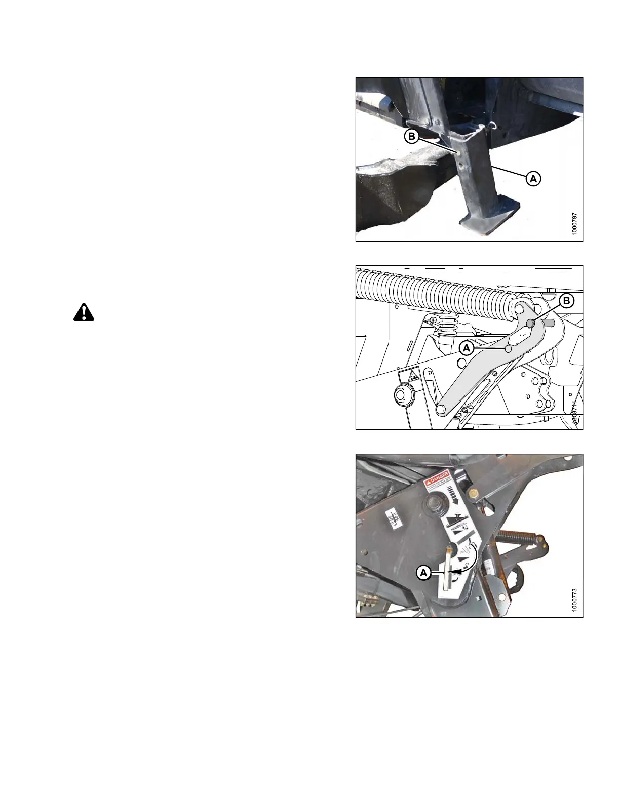 6. Lower the hea der stand (A) by pulling clevis pin (B),