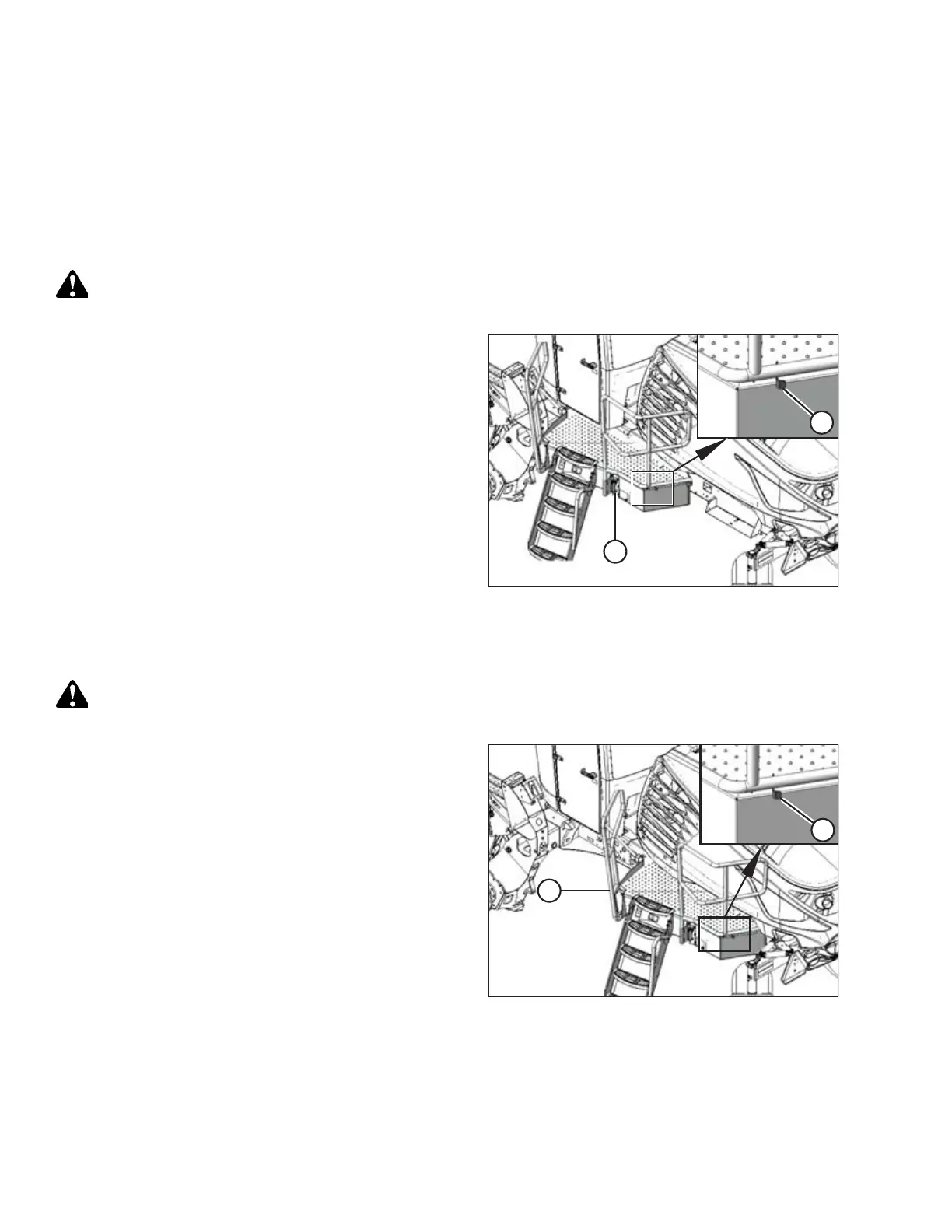 Swing-away platform and stair units are provided on the windrower for access to the operator’s station and engine bay
