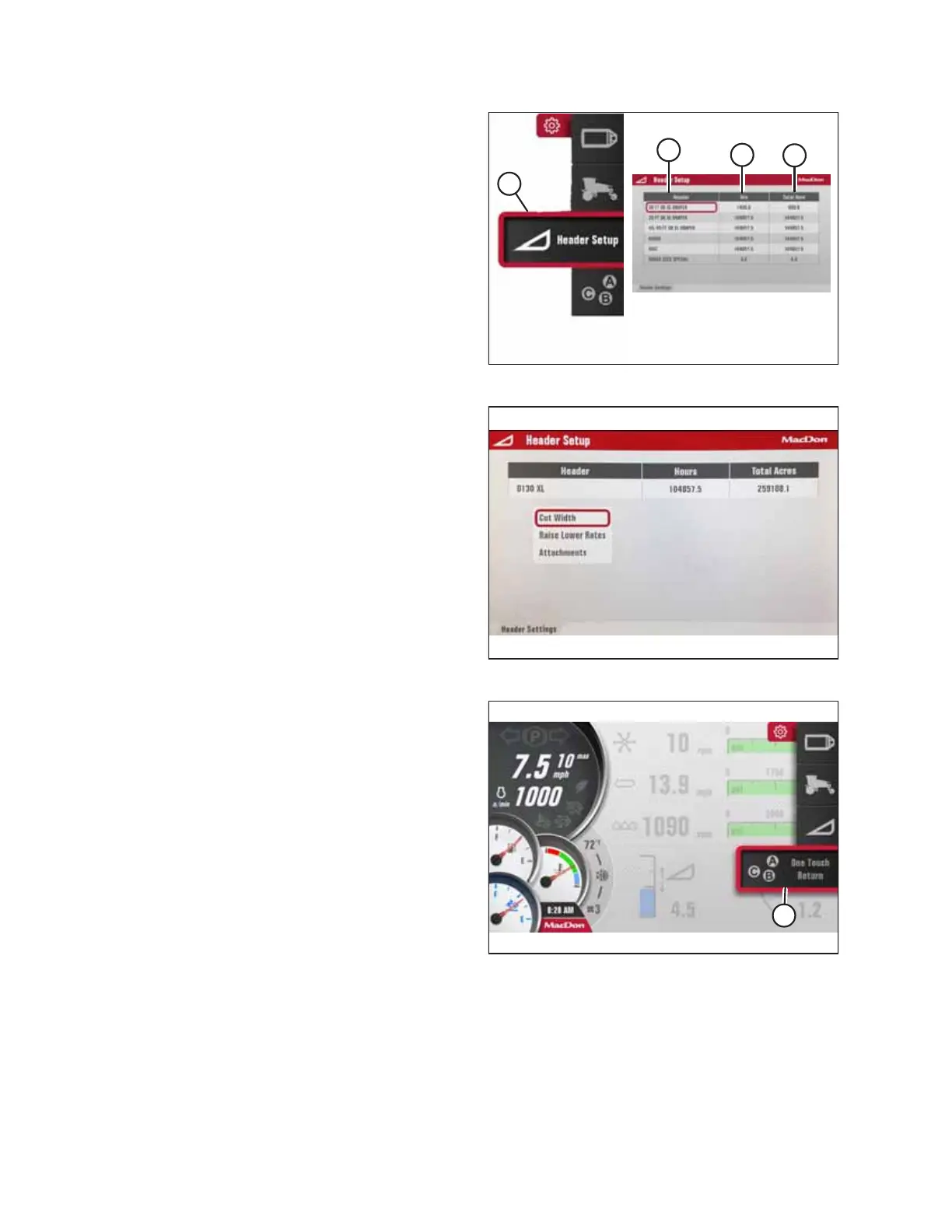 Header Setup: Icon (A) opens the HEADER SETUP menu list.