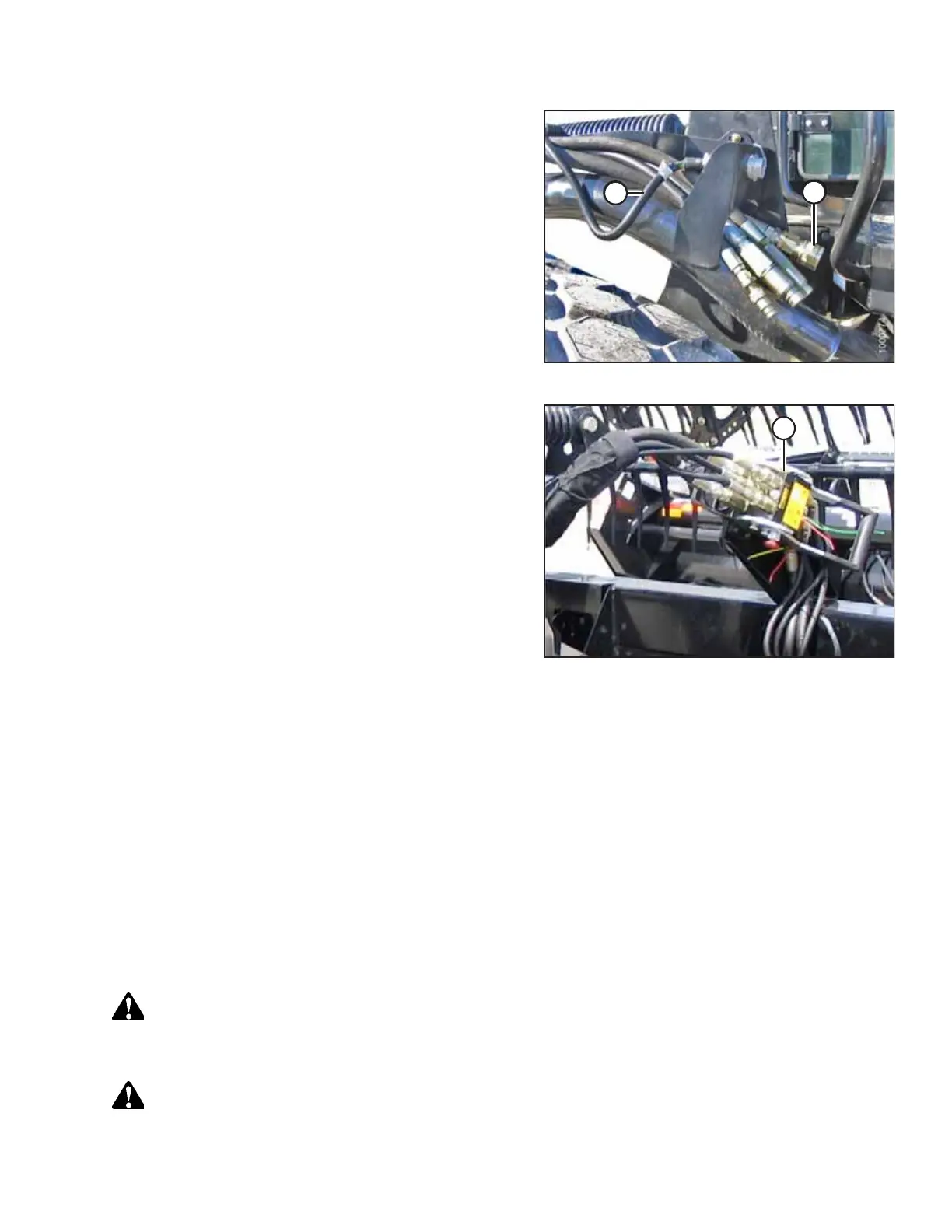 21. Connect header drive hoses (A) and electrical harness (B) to