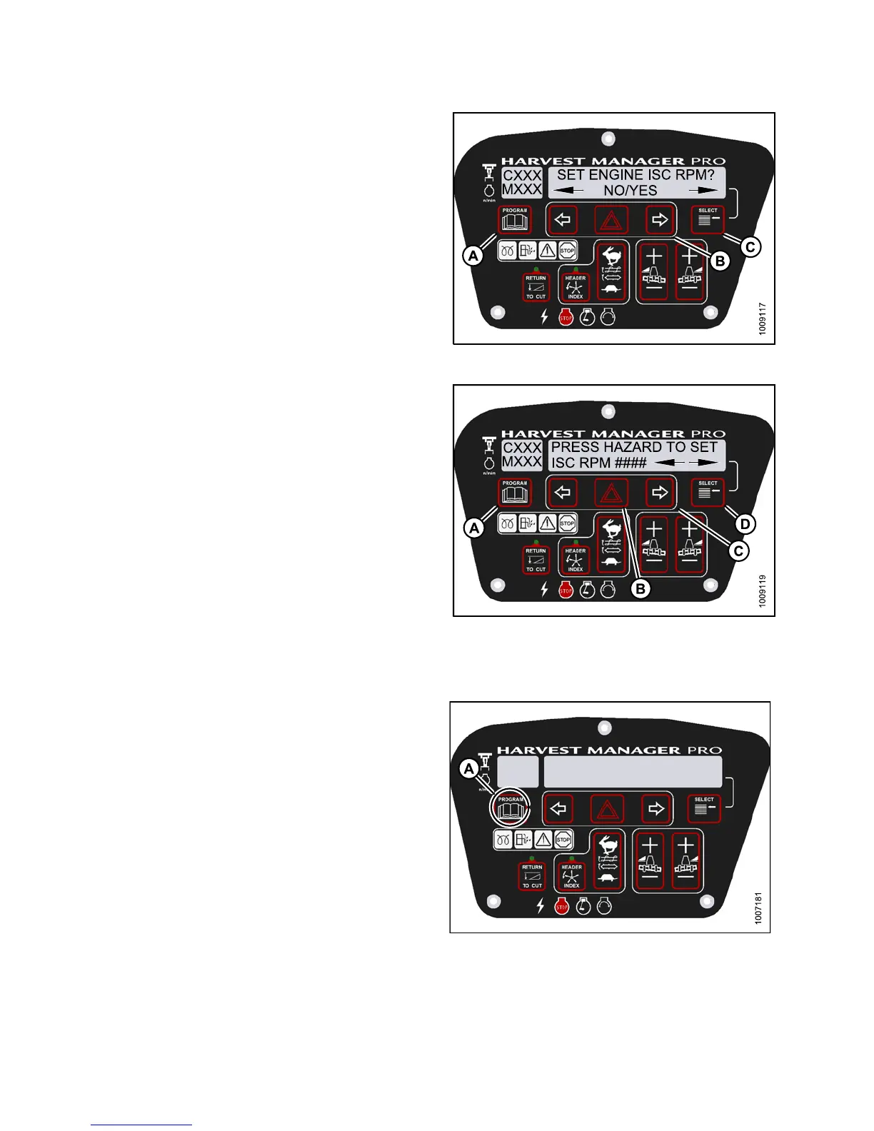 4. Press SELECT (C) until SET ENGINE ISC RPM? is