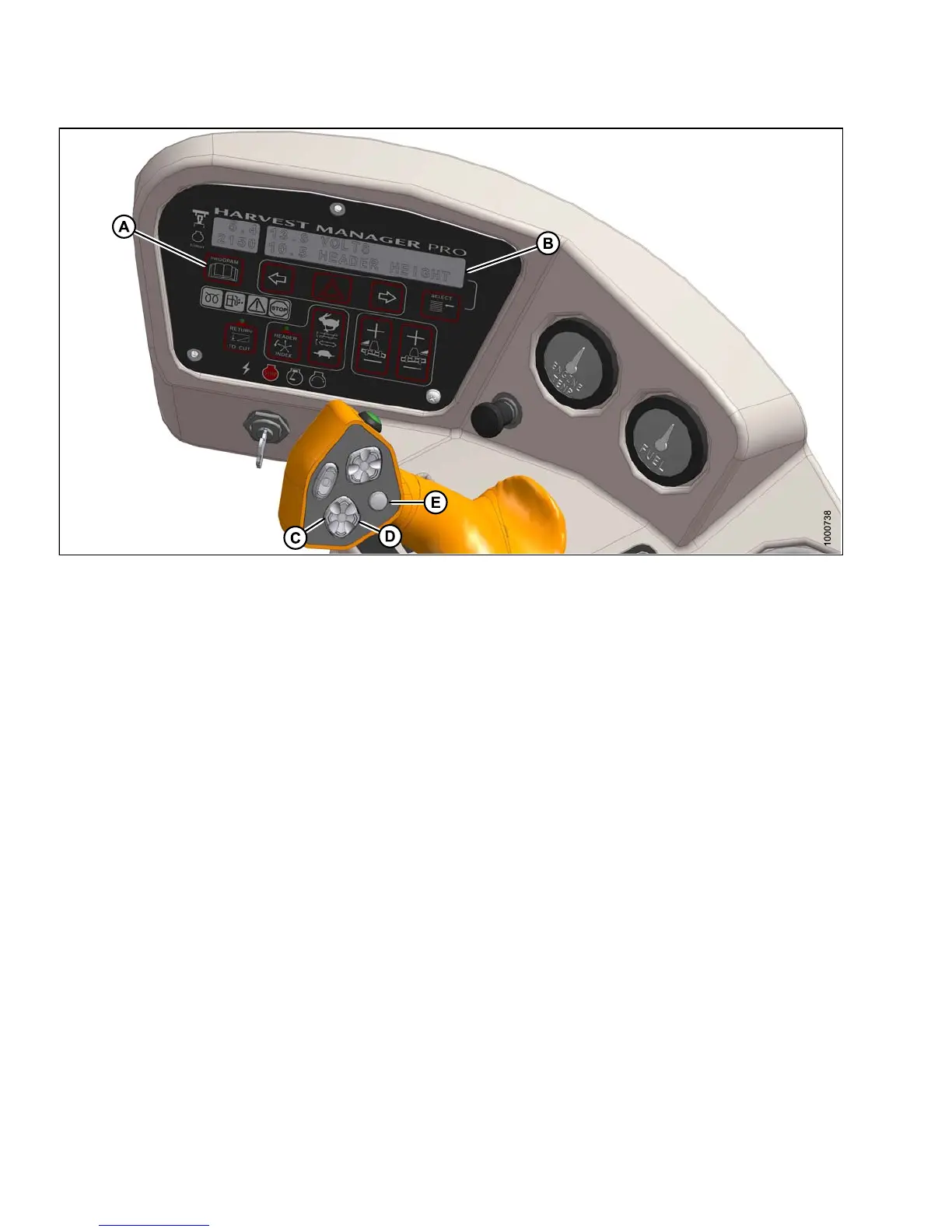 •Todecrease(flatten) header angle, operate HEADER TILT UP switch (D) on ground speed lever (GSL) handle
