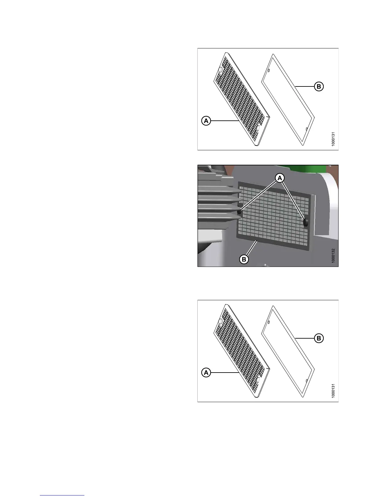 5. Secure filter assembly (B) to cab wall with knobs (A).