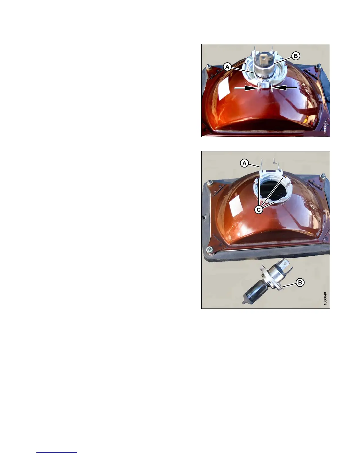 5. Align lugs (B) on new bulb with slots (C) in body and