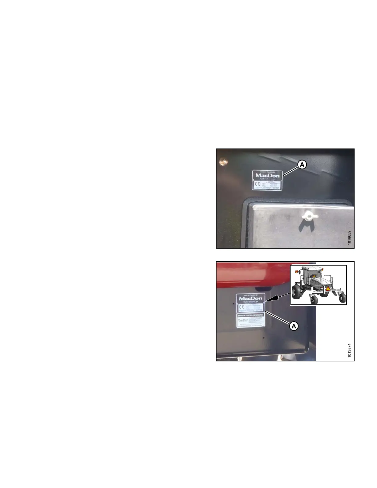 1. The windrower serial number plate (A) is located on