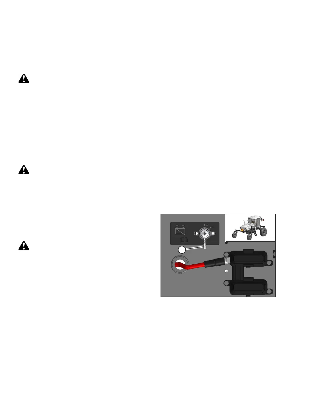 • Do NOT start engine by shorting across starter or starter relay terminals. Machine will start with drive