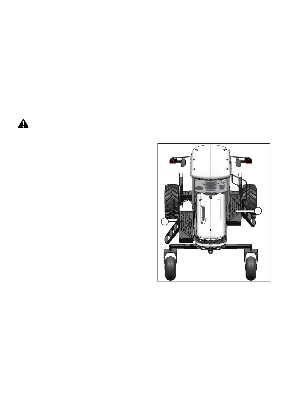 Swing-away platforms and stairs are provided on both sides of the windrower for access to the operator’s station