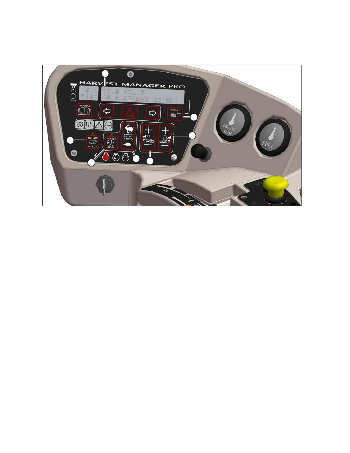 • (F) HEADER INDEX SWITCH: Links reel and conveyor speed to ground speed. Push-ON/Push-OFF.