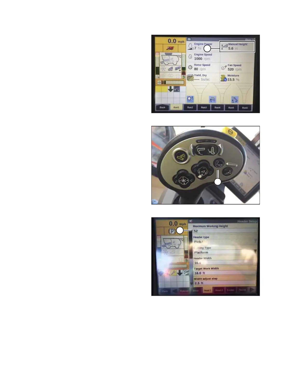 HEIGHT box (A) on the RUN 1 page on the combine display.