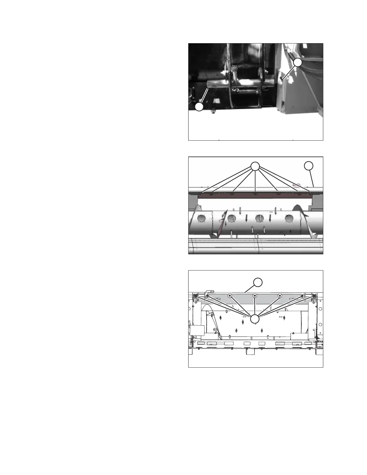 12. Loosen seven bolts (A) along top beam (B) on the auger