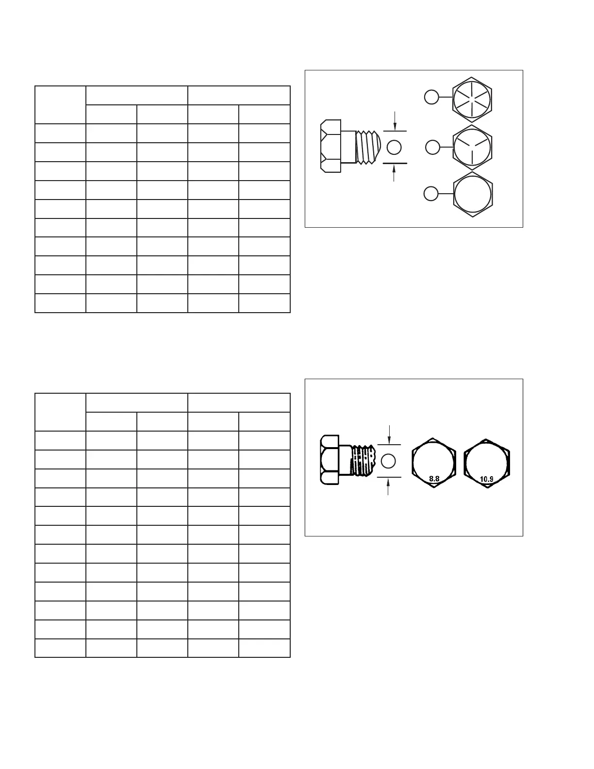 Torque values shown in following tables are valid for non-greased, or non-oiled threads and heads; therefore, do NOT