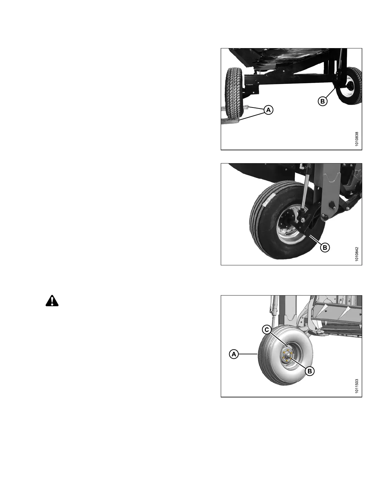 1. Position wheel (A) on spindle, install bolts (B), and