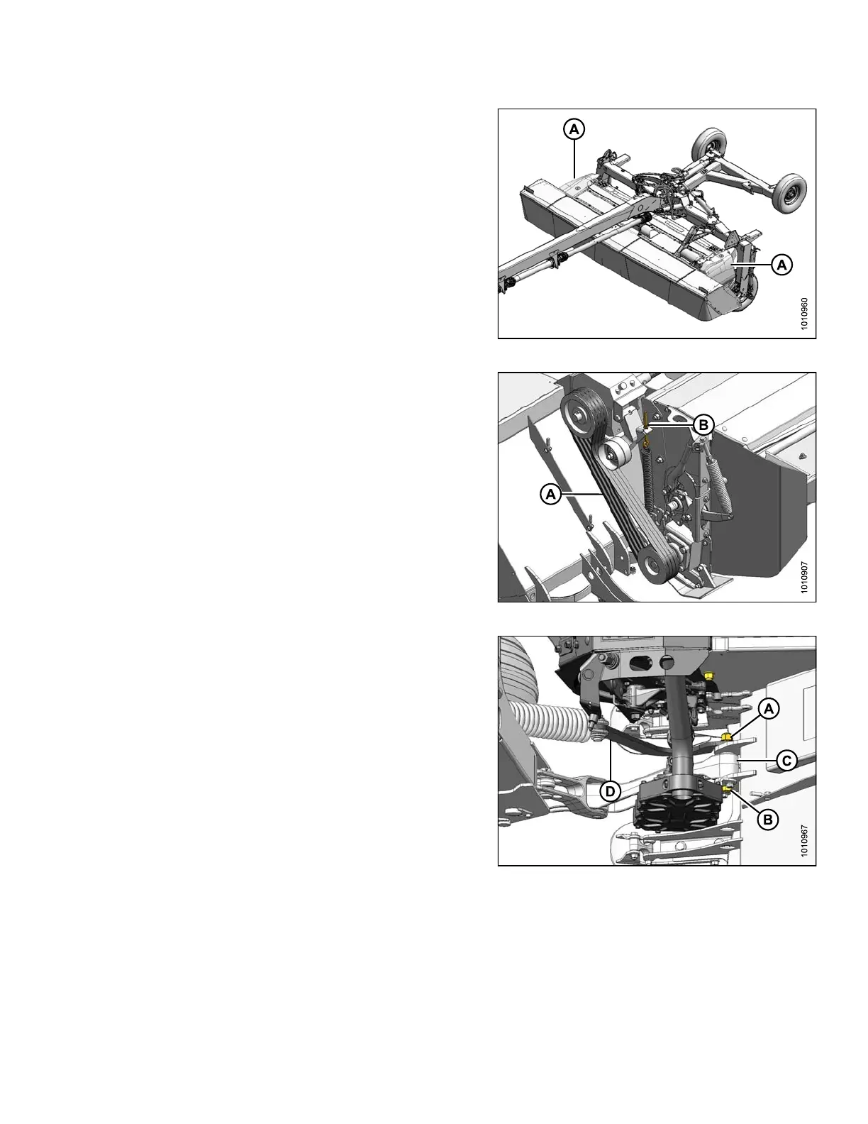 a. Back off jam nut and tensioner nut (B) on belt idler