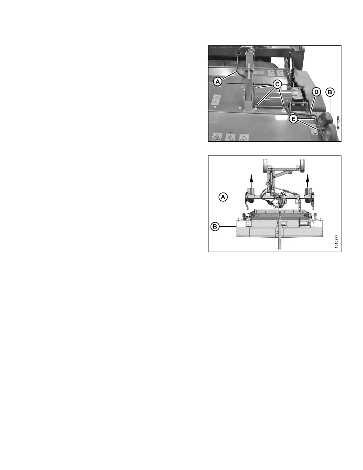 28. Start tractor, slowly back carrier (A) off header (B), and