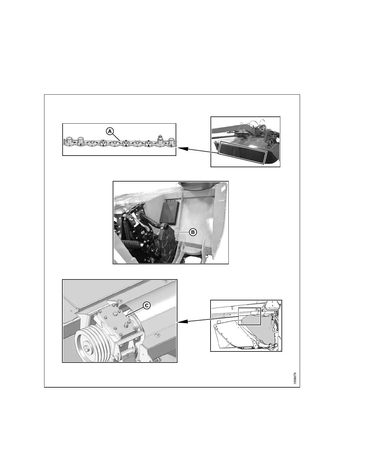 A - Cutterbar Lubrication Location B - Conditioner Drive Gearbox C - Mower Conditioner Drive Gearbox