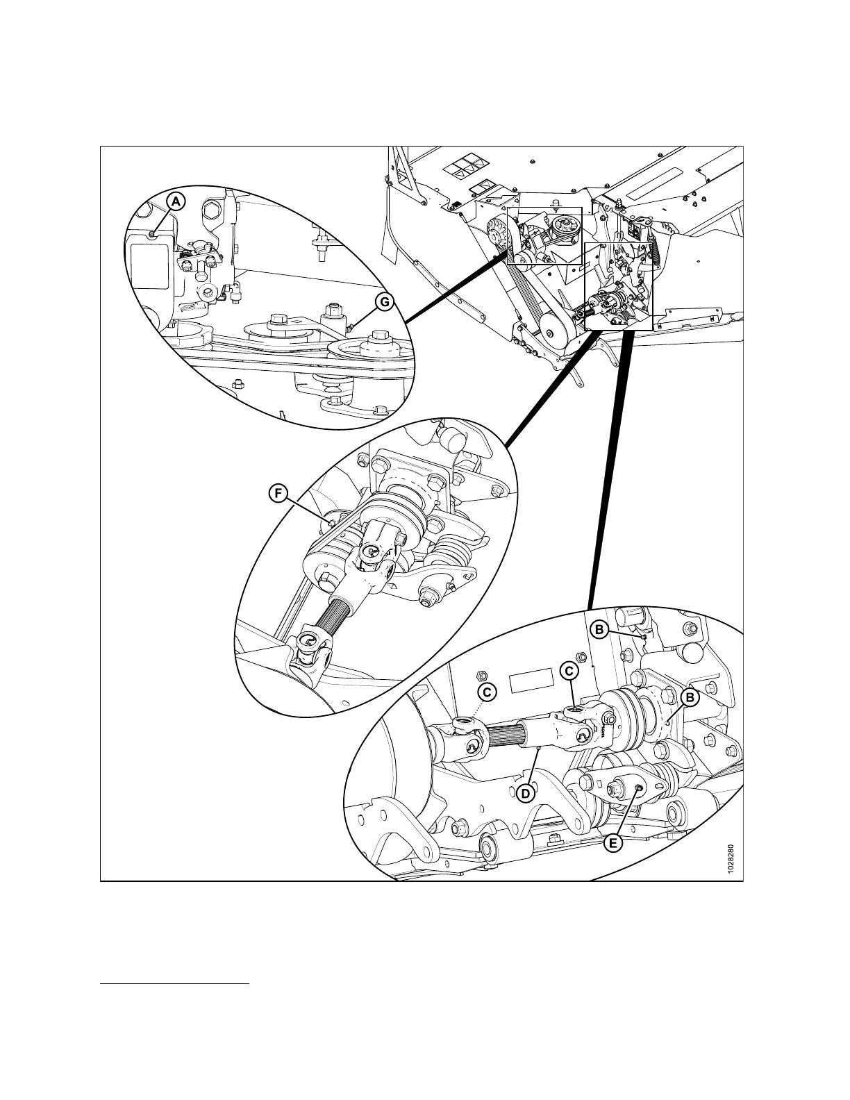A - Idler/Tensioner Pivot B - Bearing, Roller Conditioner (2 Places) C - U-Joint, Conditioner Driveline (2 Places)