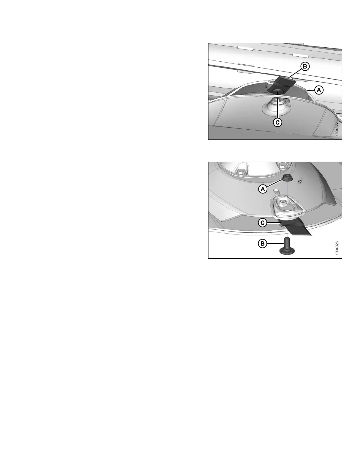 8. Remove shoulder bolt (B) and blade (C).