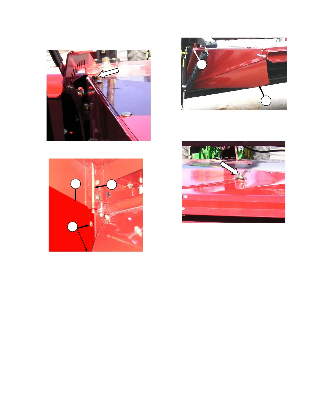 c. Remove hinge bolt (B). Position side deflector