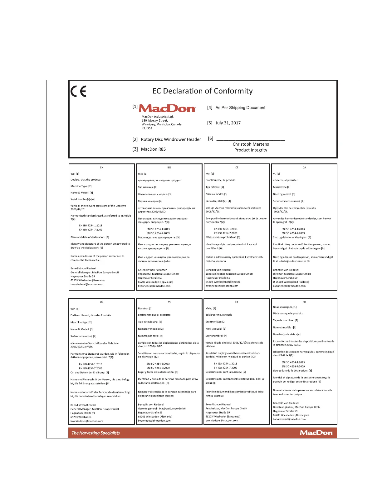 MacDon R85 - Declaration of Conformity