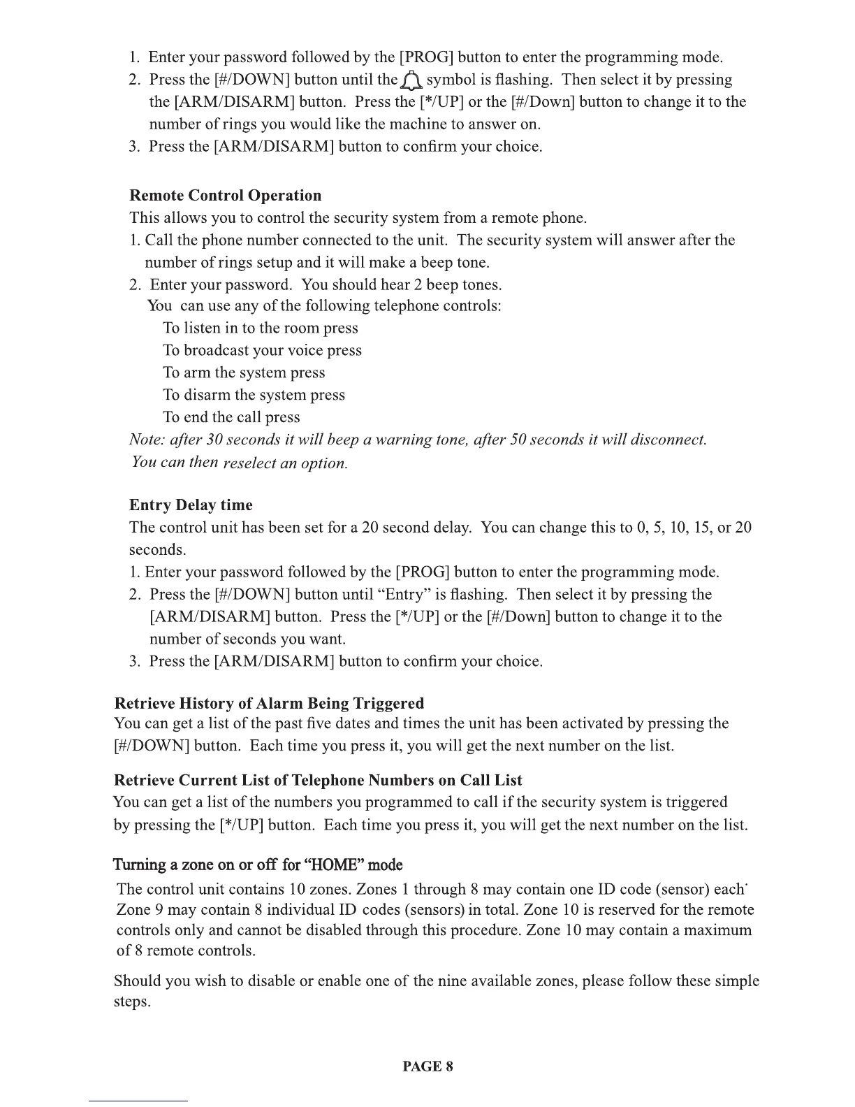 Mace 80355 - Remote Control Operation; Entry Delay Time Configuration; System Data Retrieval and Zone Management