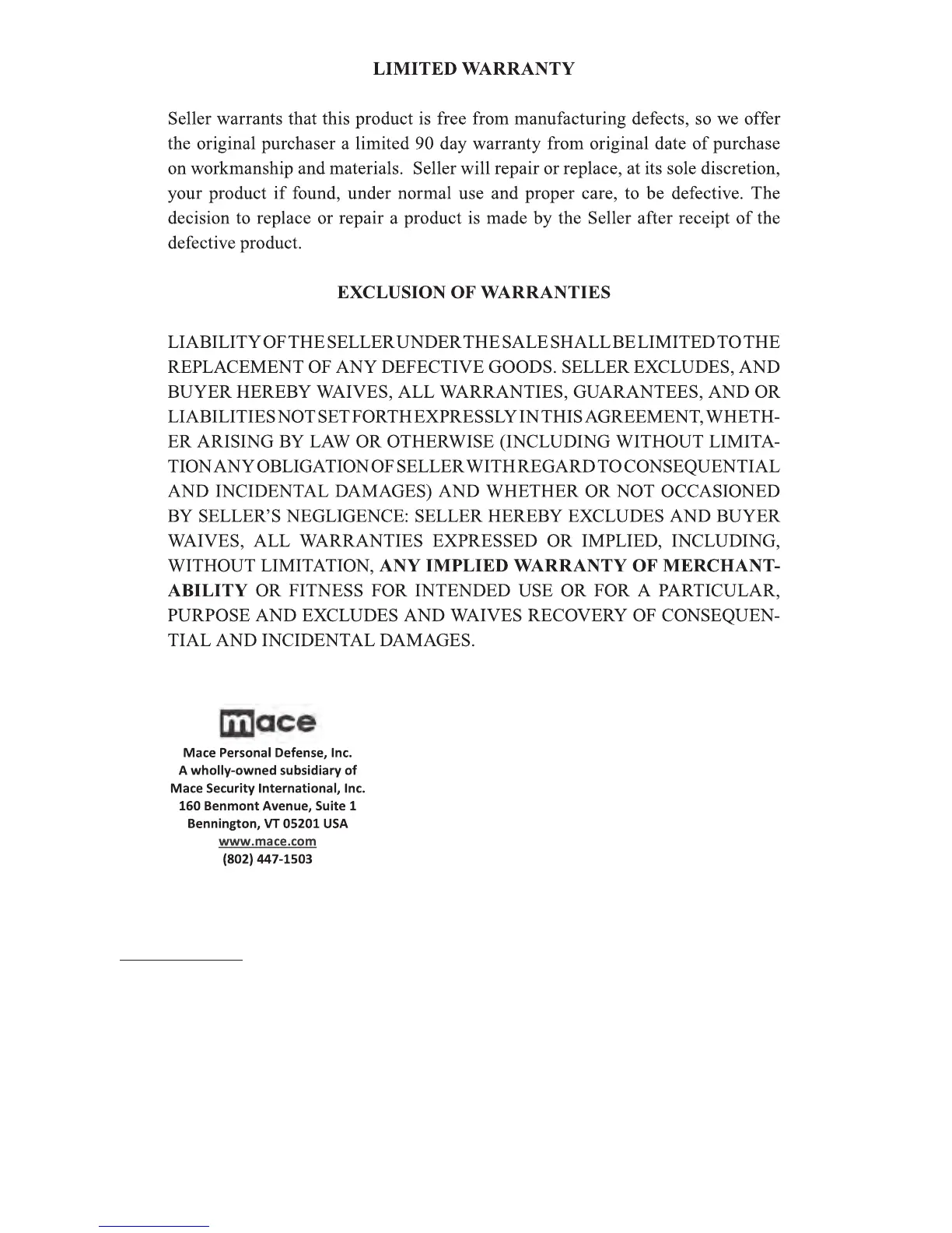 Mace 80355 - Limited Warranty; Exclusion of Warranties