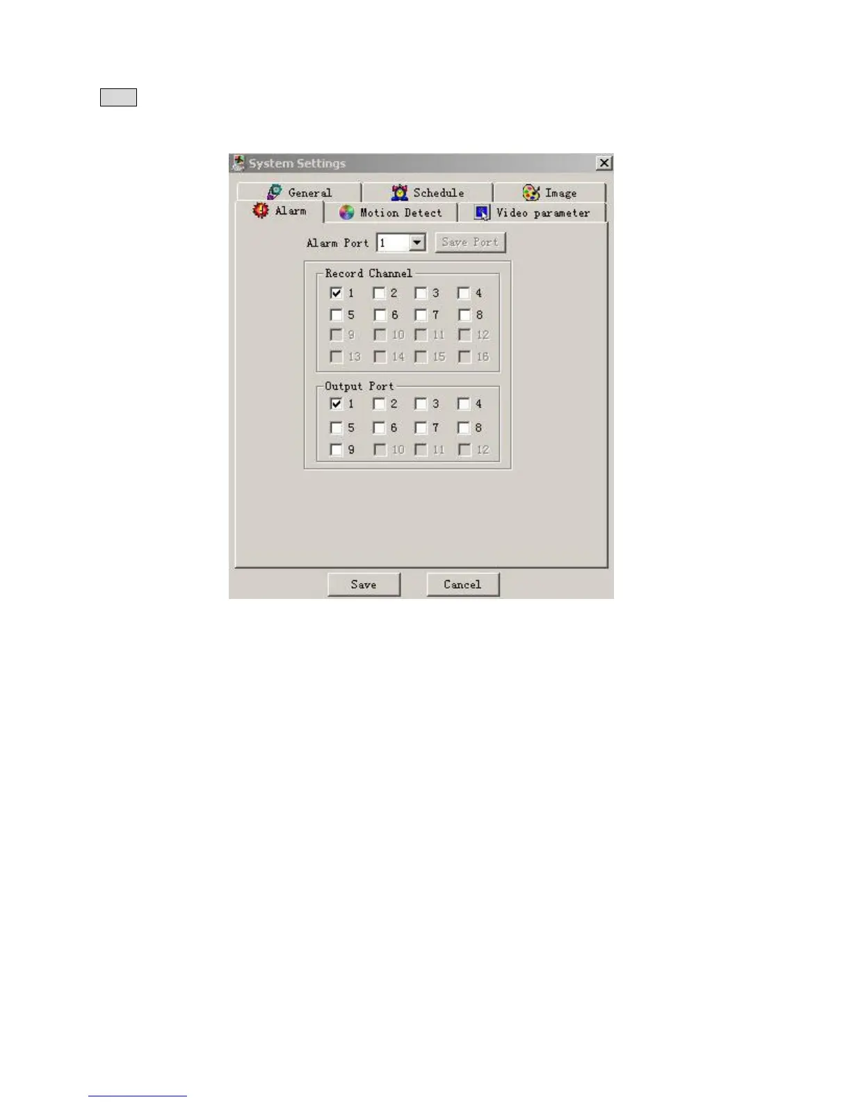 Alarm When there are alarm input signals, the user can select the recording channel and the output port for the