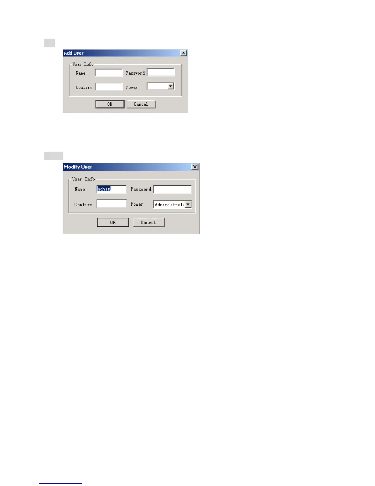 The Admin User can add user information in this dialogue box, and assign user power level. Note: There is only