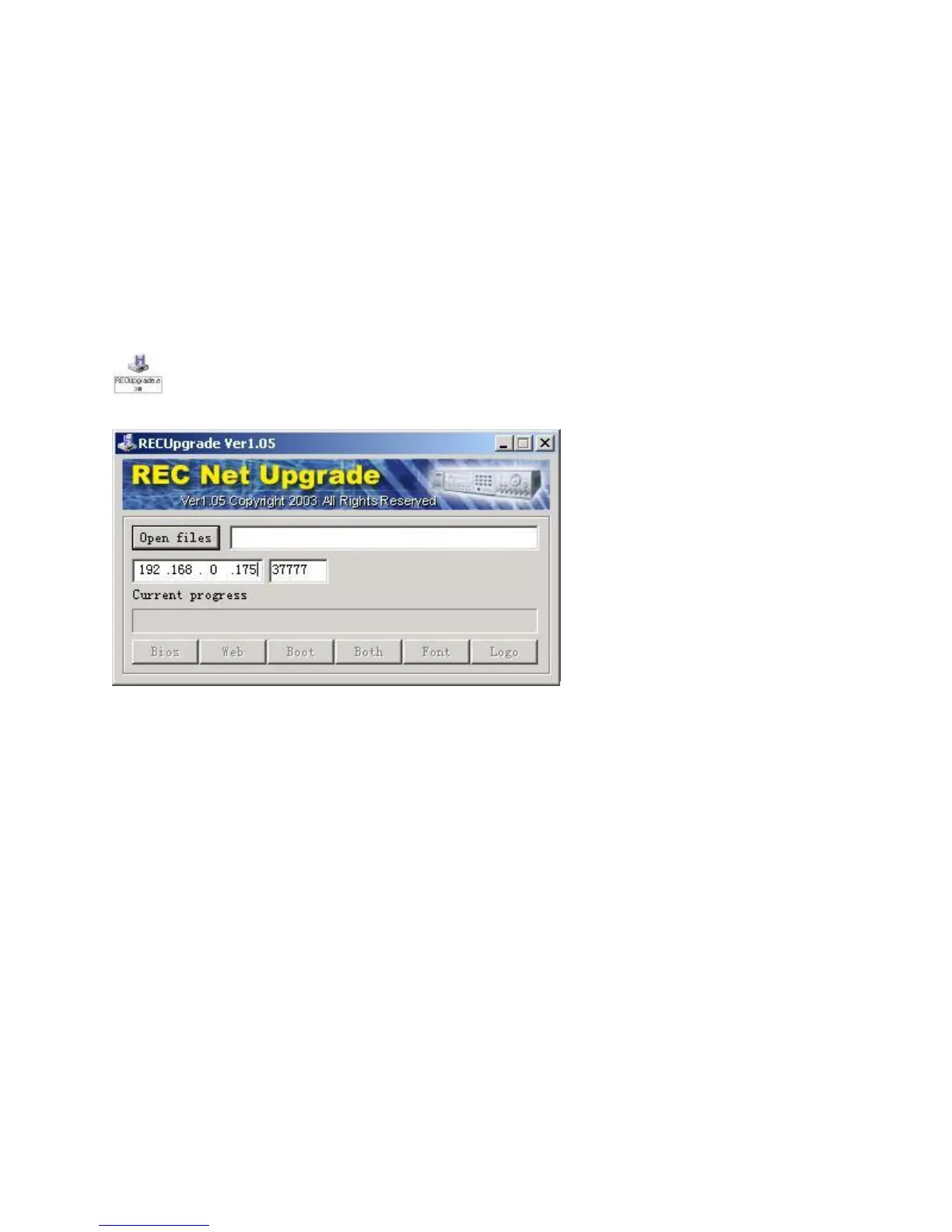 open upgrade software tool RecUpgrate.exe , input the IP address of the DVR, then open boot file *_boot(*).bin to be upgraded,