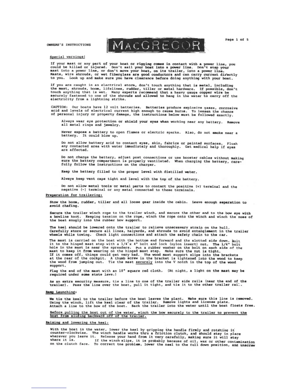 MACGREGOR 25 - Owners Instructions and Procedures; Special Warnings and Safety Precautions; Preparation for Trailering; Ramp Launching and Recovery