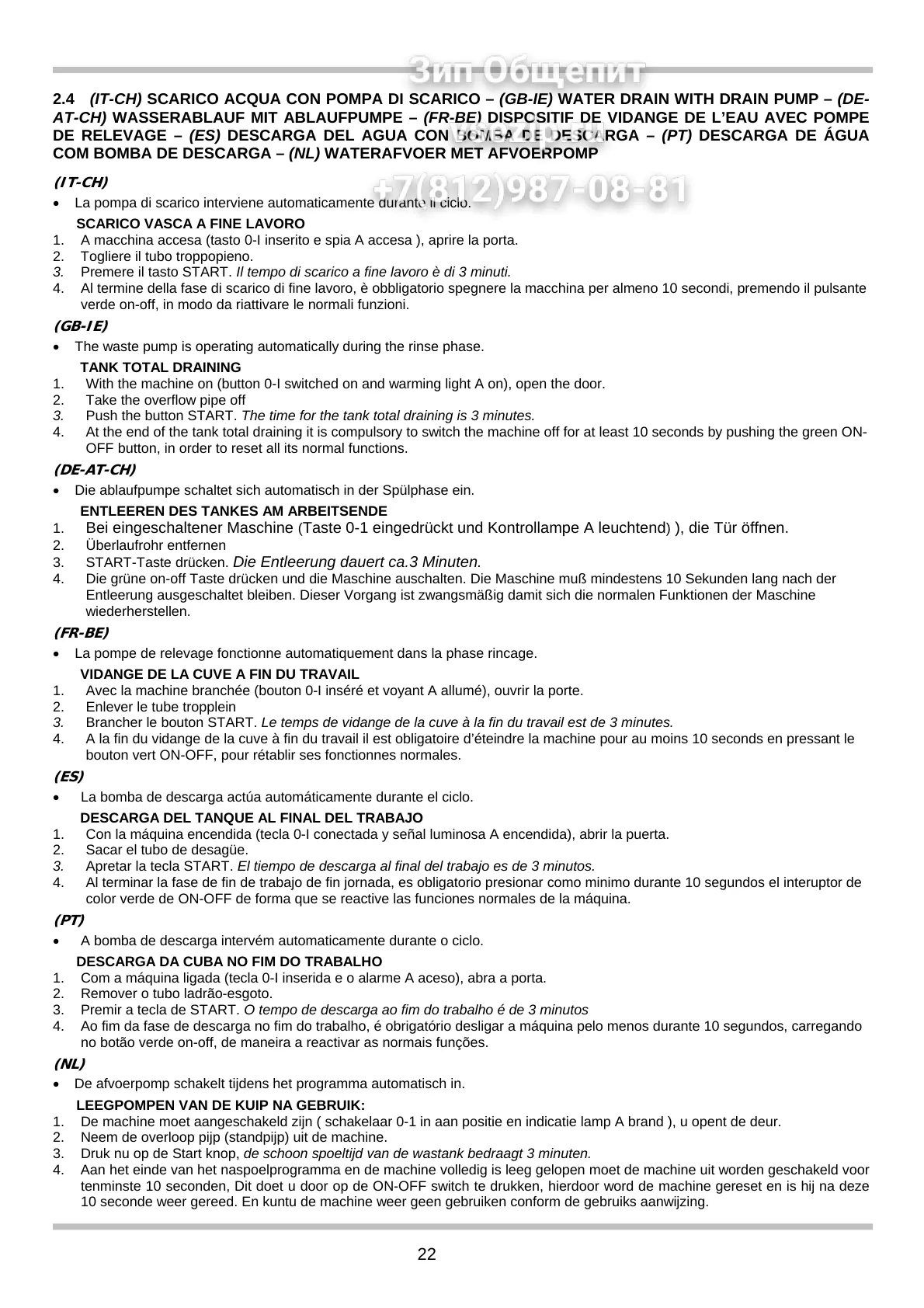 2.4 (IT-CH) SCARICO ACQUA CON POMPA DI SCARICO – (GB-IE) WATER DRAIN WITH DRAIN PUMP – (DE-