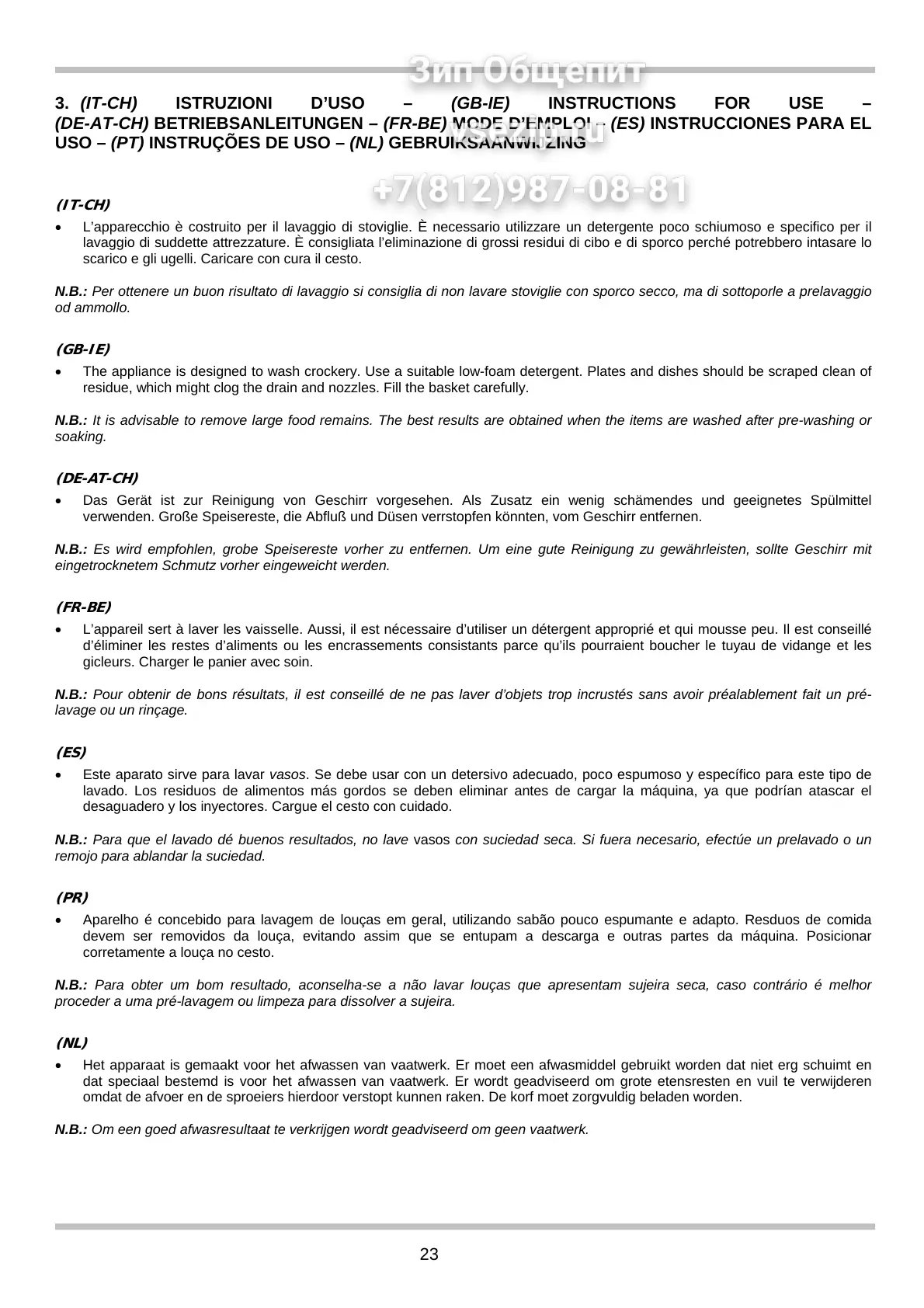N.B.: It is advisable to remove large food remains. The best results are obtained when the items are washed after pre-washing or