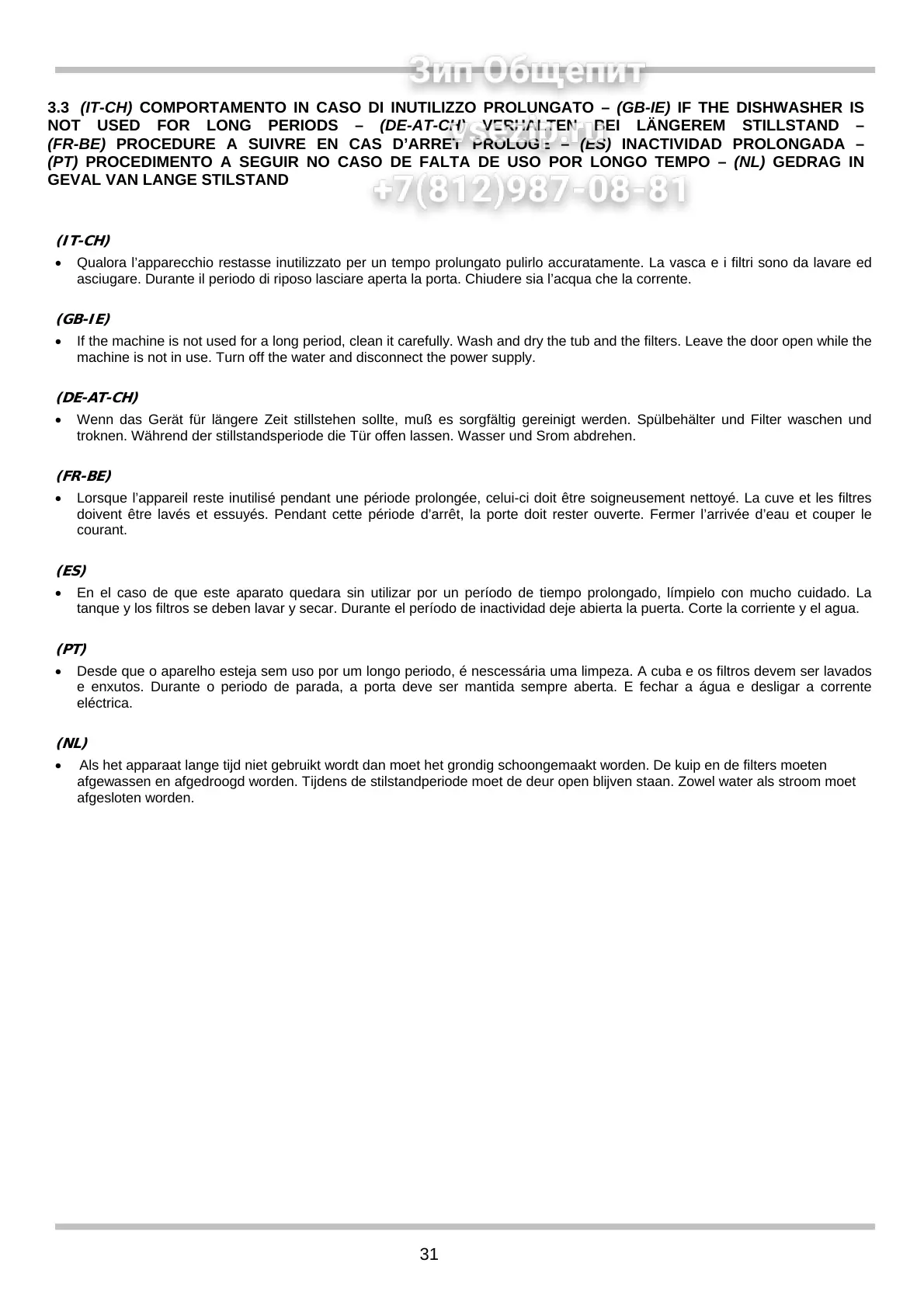 3.3 (IT-CH) COMPORTAMENTO IN CASO DI INUTILIZZO PROLUNGATO – (GB-IE) IF THE DISHWASHER IS