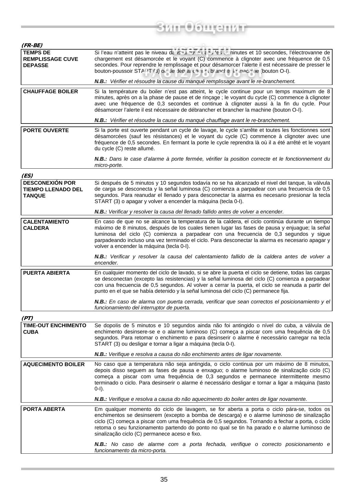 N.B.: No caso de alarme com a porta fechada, verifique o correcto posicionamento e
