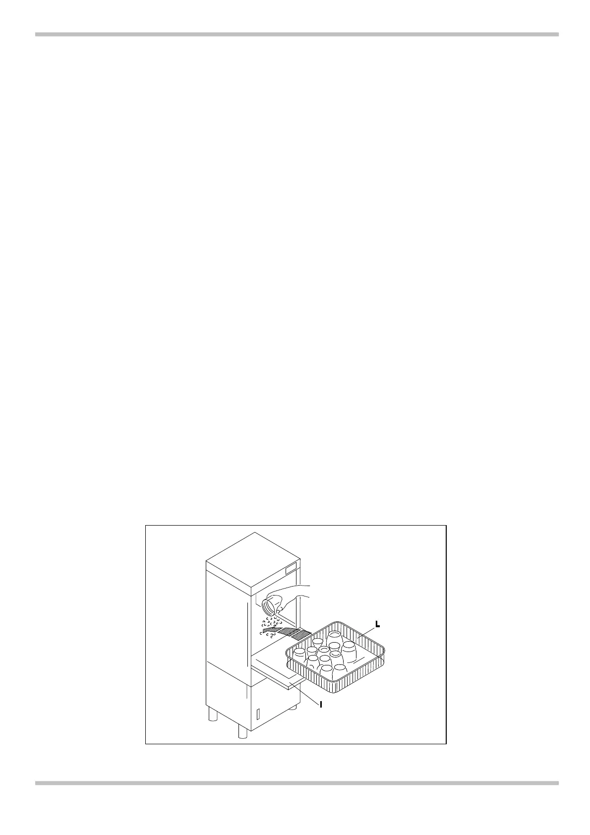 Doe na het vollopen de deur open (I) en doe er afwasmiddel in (ongeveer 2 g per liter inhoudscapaciteit van de kuip). Doe de