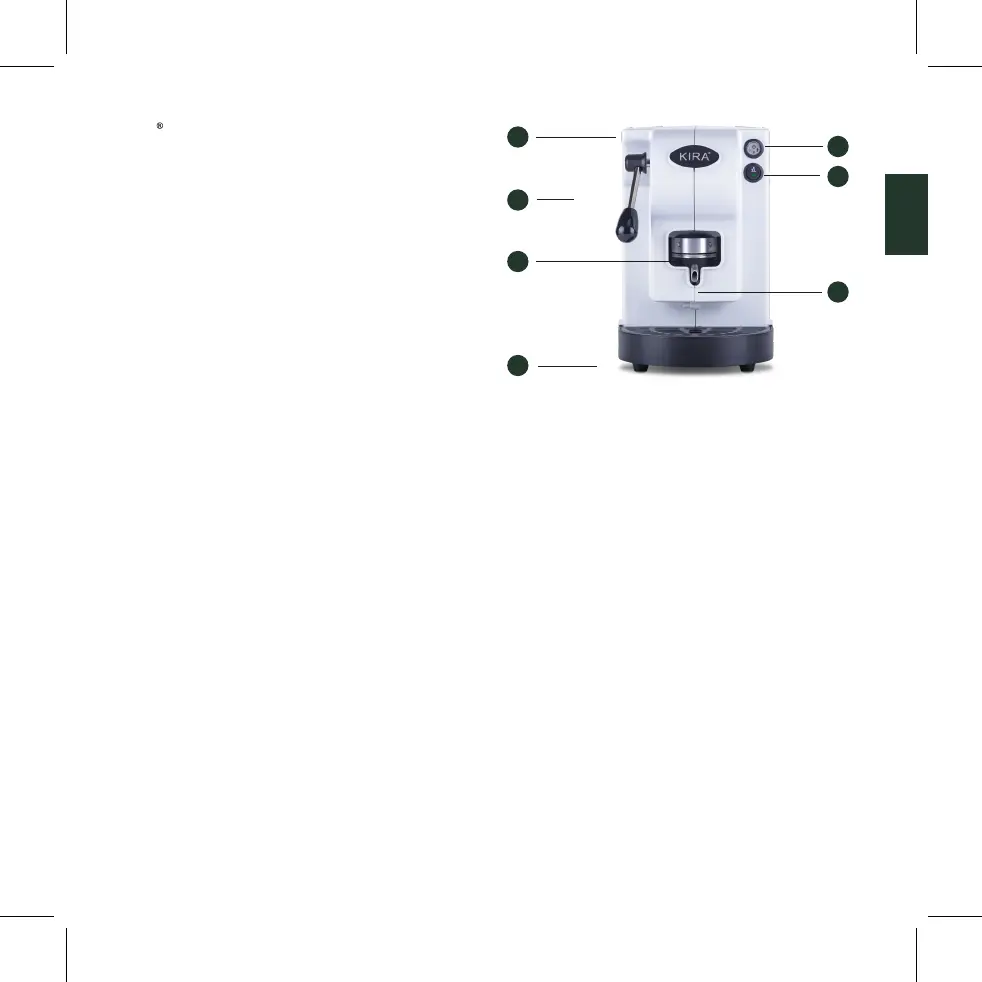 (1) ON/OFF switch (2) Coee erogation switch (3) Closing pod lodge lever (4)