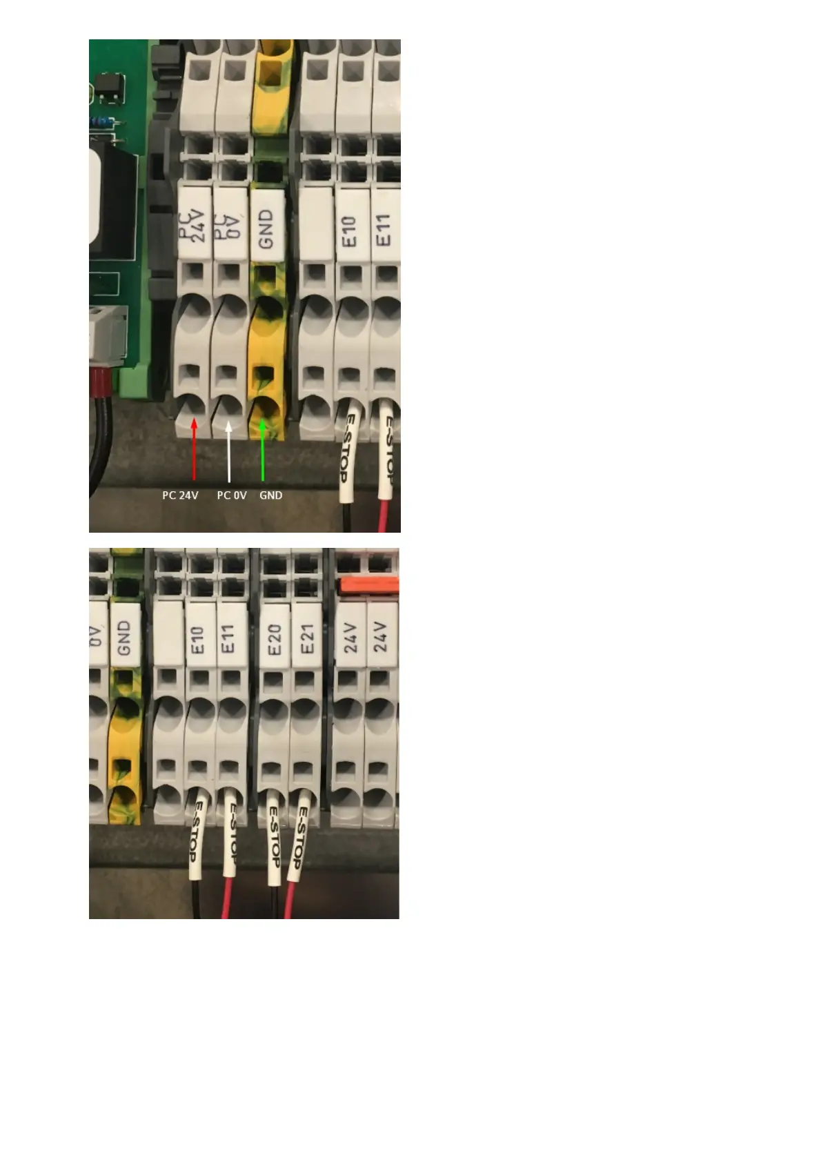 external E-stop into the 24V block and the other side into the blank terminal block. Then connect the red wire from the