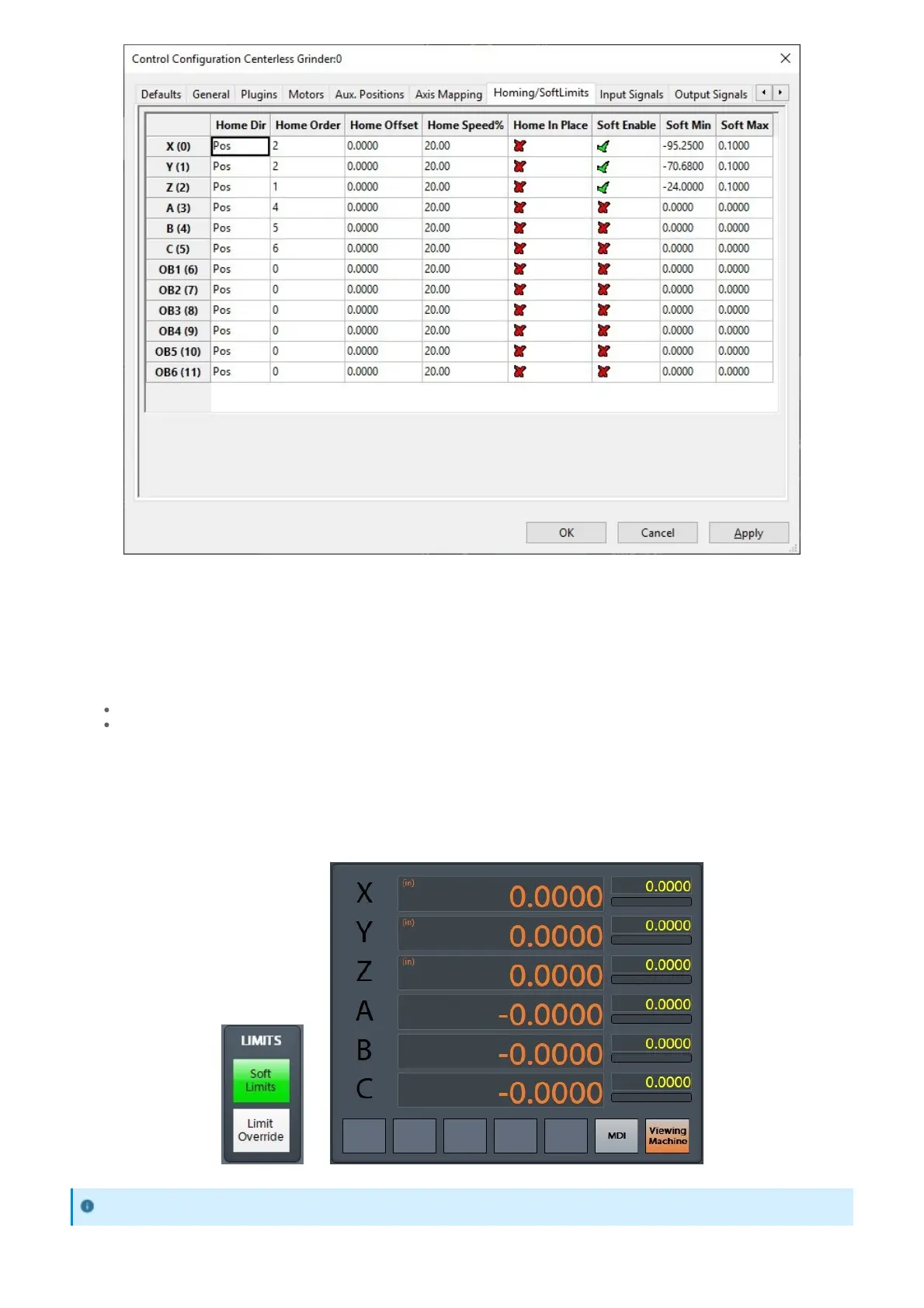 7. Enter the corresponding recorded positions for each axis into Soft Min and Soft Max.