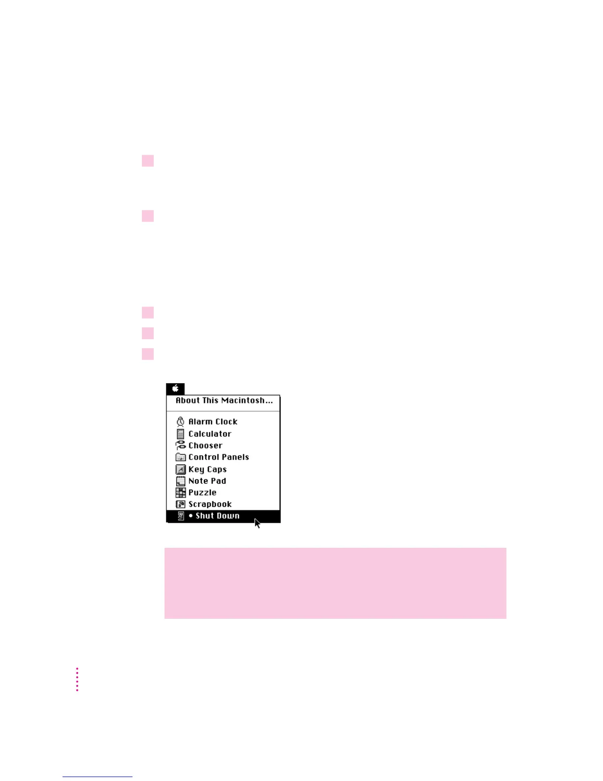 Apple (K) menu. Detailed instructions follow. (Note: The Shut Down