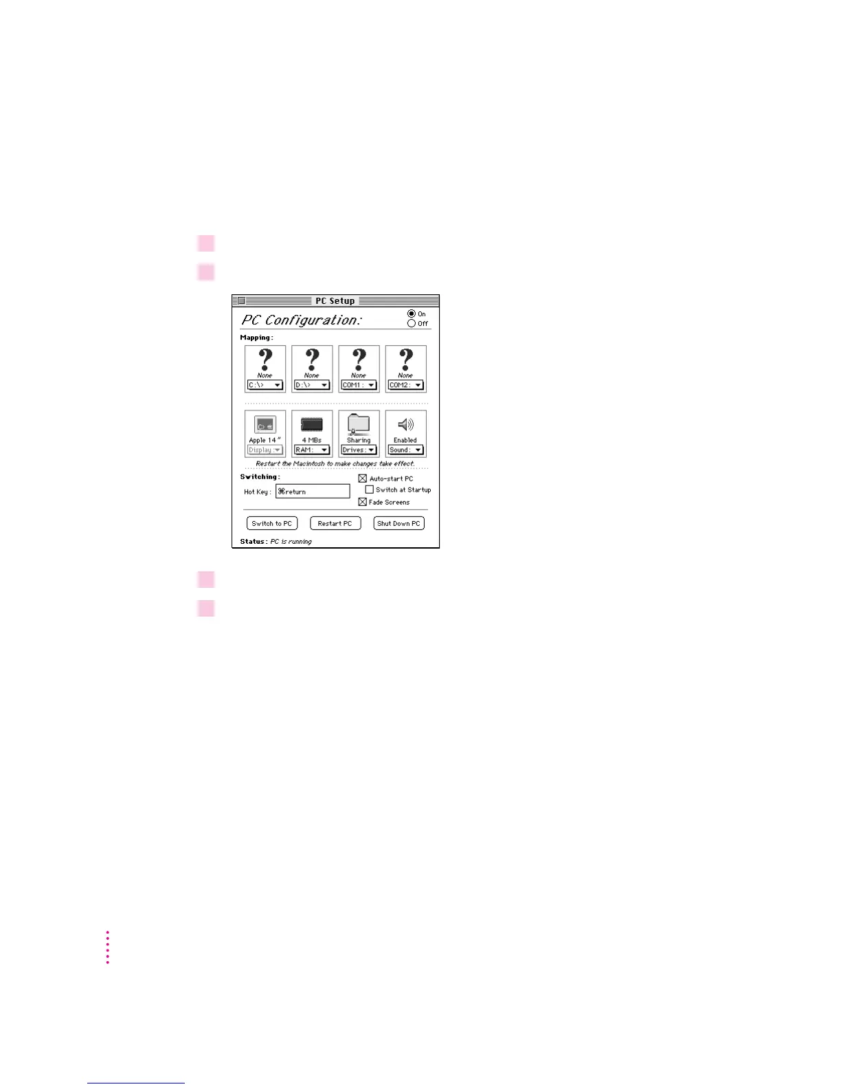 You switch between the Mac OS and the PC environment using the PC Setup