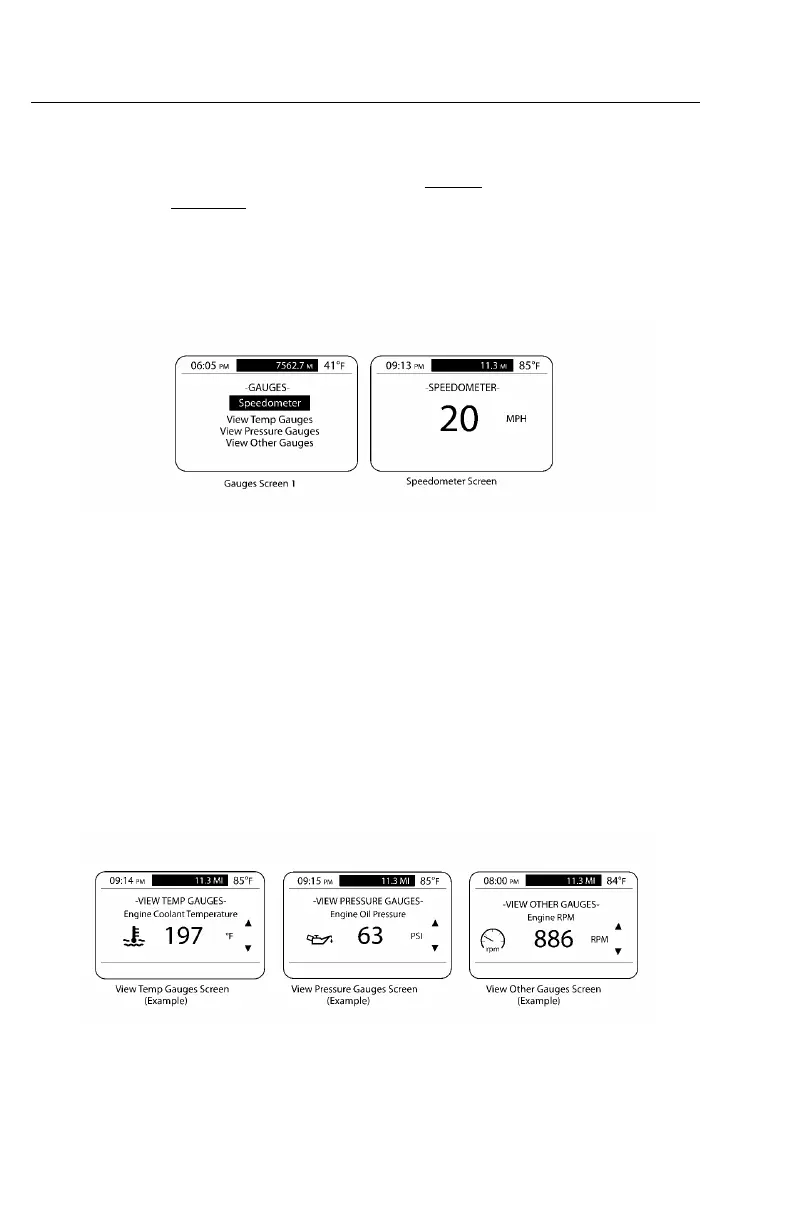 valueandsensorinformation.ToviewthescreensoftheGaugessubmenu,highlight