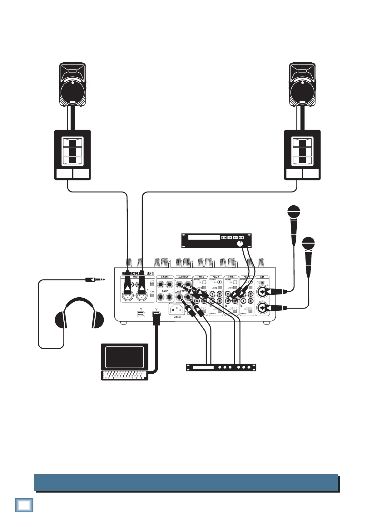 This diagram shows a CD player and microphones connected, with an effects device in the aux loop,