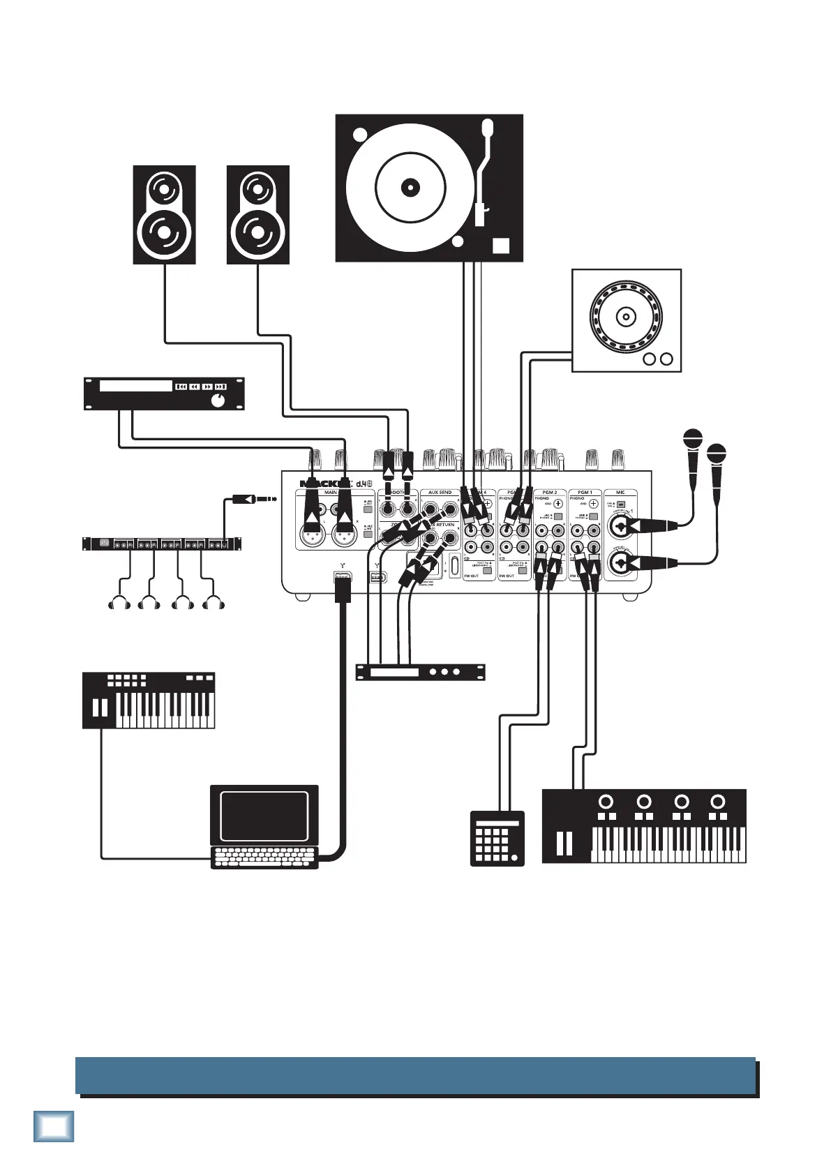 This diagram shows a keyboard, drum machine, turntable and CD turntable, with two microphones.