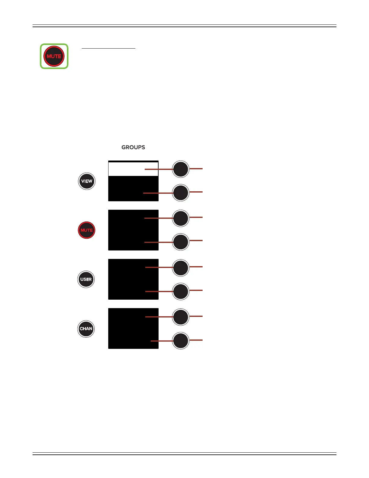 Pressing the MUTE button will present all mute groups in each of the four displays as noted below.