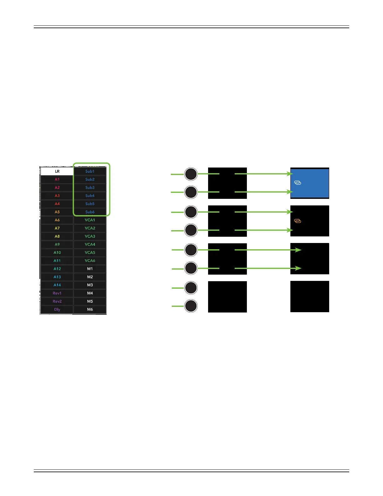 When a sub is selected, only the input channels that are associated with the selected sub are displayed.