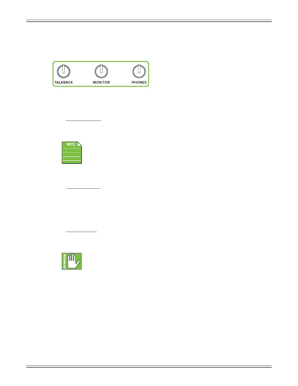 talkback, monitor and headphones levels. Because these are analog controls, they are NOT recallable.