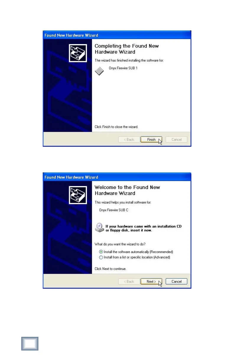 The “Found New Hardware Wizard” opens again to install the Onyx