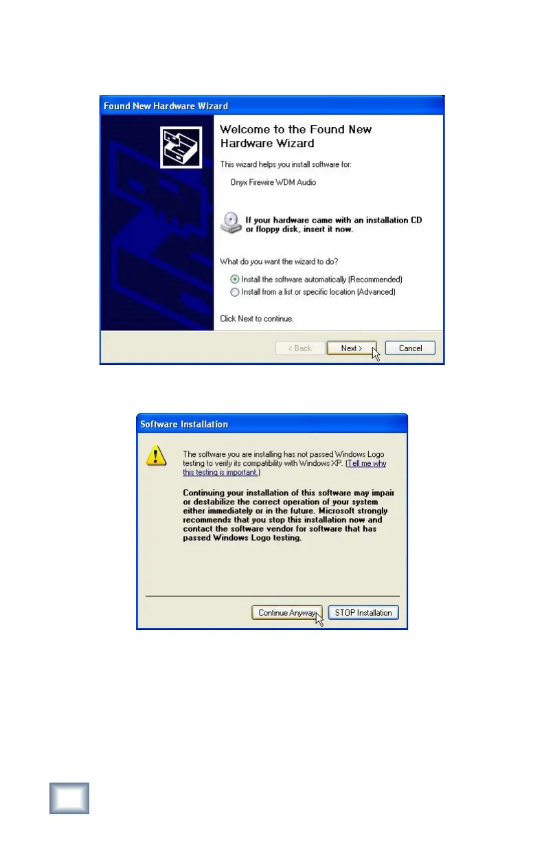 16. The “Found New Hardware Wizard” opens once again for the Onyx FireWire
