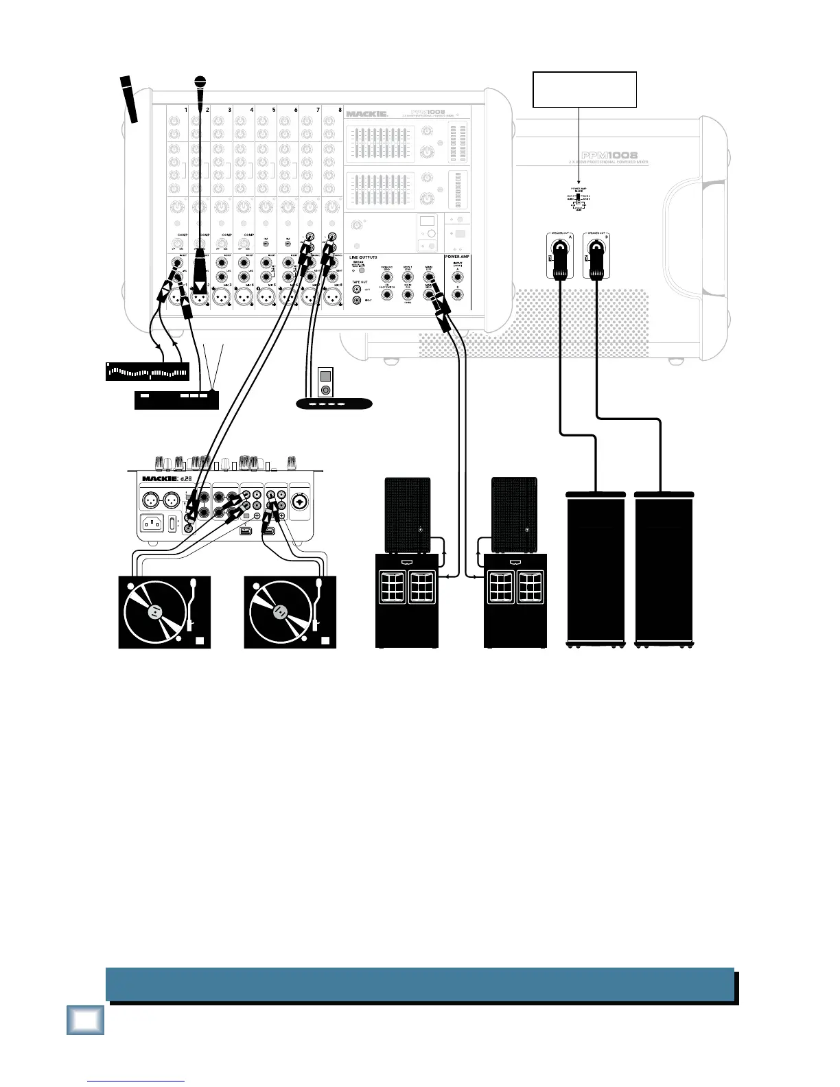 Deux platines sont connectées à une console Mackie d.2 Pro, dont la sortie RCA est reliée aux entrées