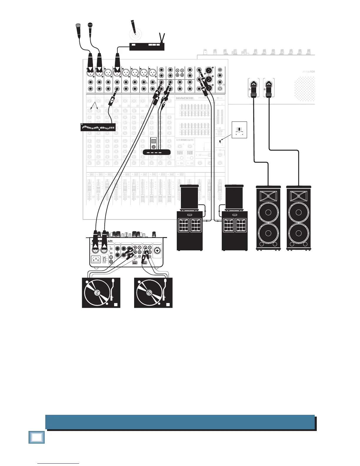 This diagram shows microphones connected to the mic inputs of channels 1 and 2, a wireless micro-